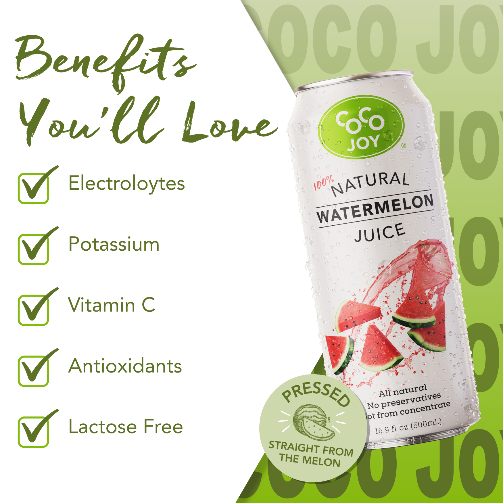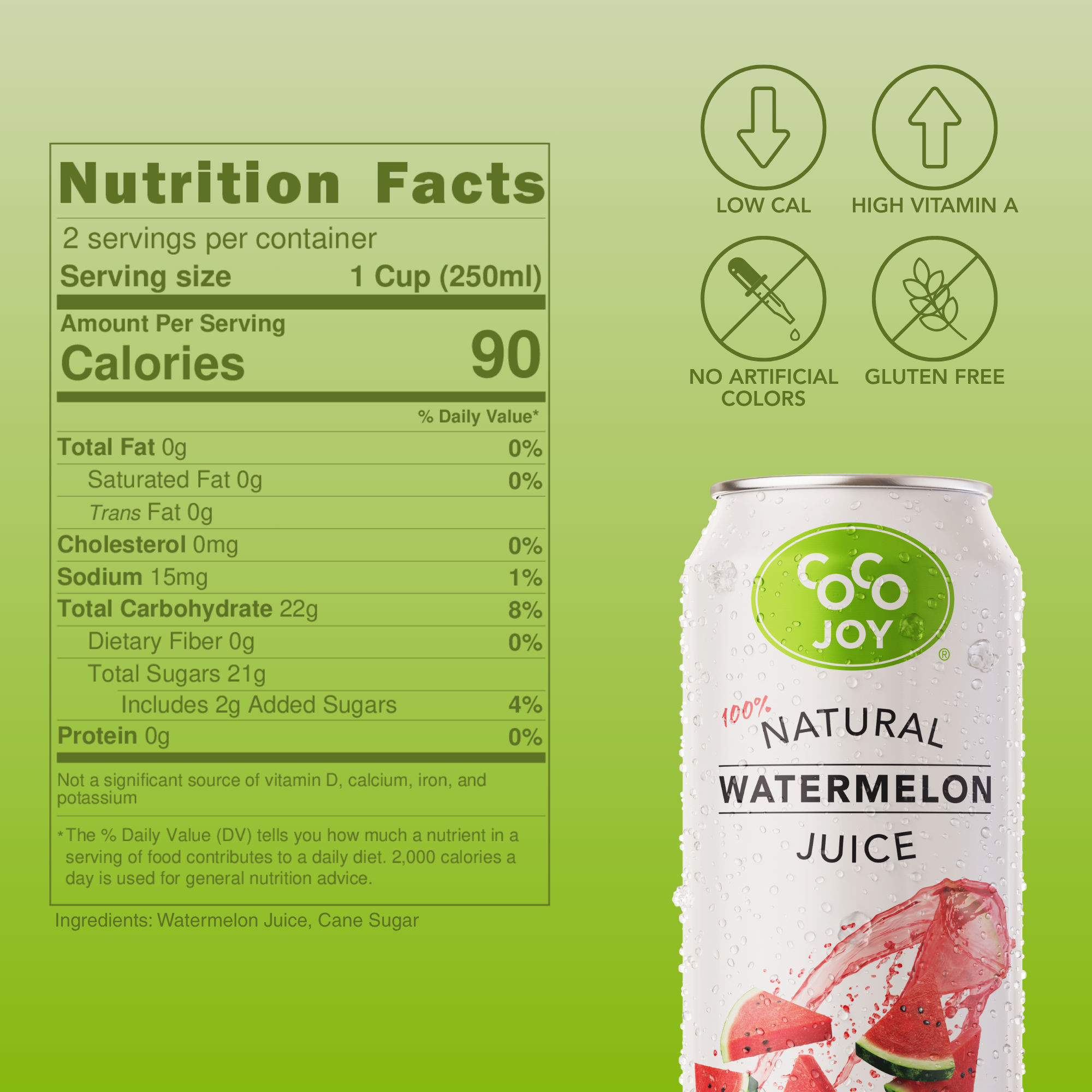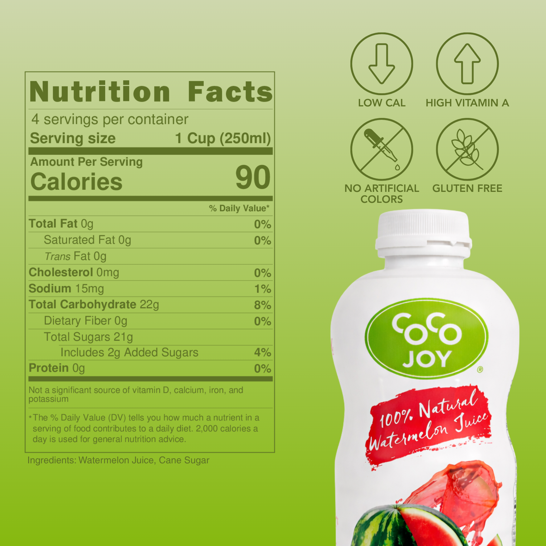 CoCo Joy Natural Watermelon Juice is the natural choice for everyday on-the-go refreshment. Our juice drink is all natural, kosher, non-GMO, gluten-free, lactose-free, and dairy-free. What you get is a pure, healthy, refreshing fruit taste.